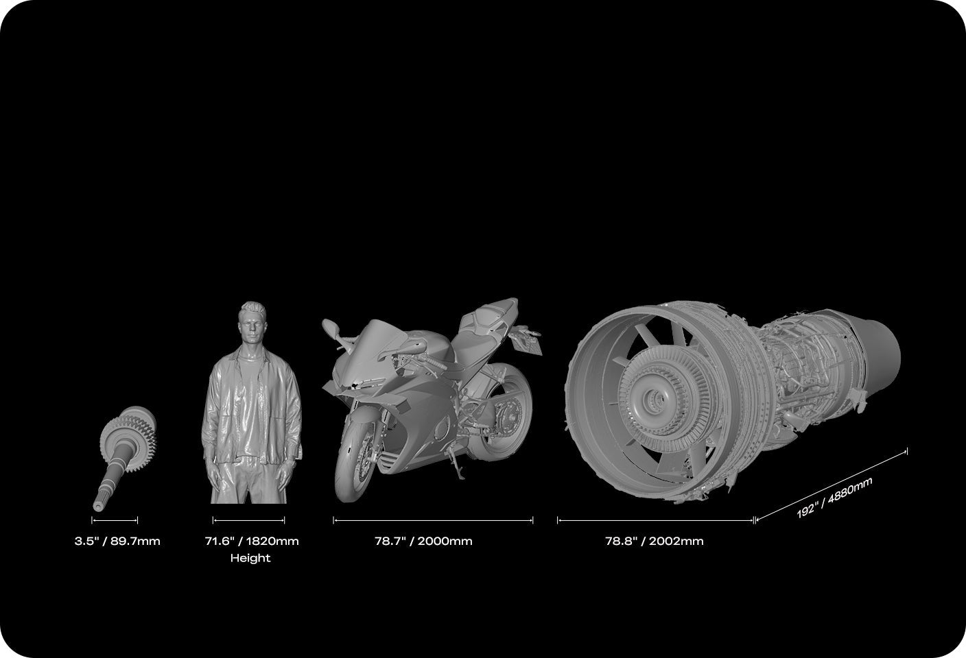 0.02 mm + 0.03 mm/m hacimsel doğruluk ile yeniden yapılandırma (reconstruction) sırasında boyutsal doğruluğu otomatik olarak düzeltir. Mühendislik, restorasyon ve kalite kontrol (denetim) gibi hassasiyetin önemli olduğu uygulamalar için idealdir.